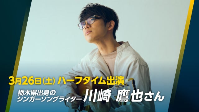 26(土)のハーフタイムには、栃木県那須塩原市出身シンガーソングライター川崎鷹也さんの応援LIVEを実施!「魔法の絨毯」がSNSを中心に大ヒット。